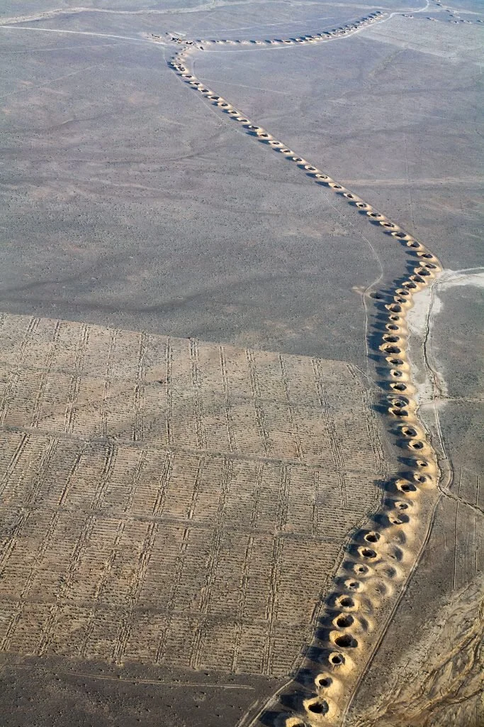 A line of evenly spaced spoil craters snake along the surface of the desert from the high Elburz Mountains to the Plains of Iraq and is the only evidence of an invisible, subterranean man-made water stream called a qanat, first constructed by the Persians during the early years of the first millennium BCE.